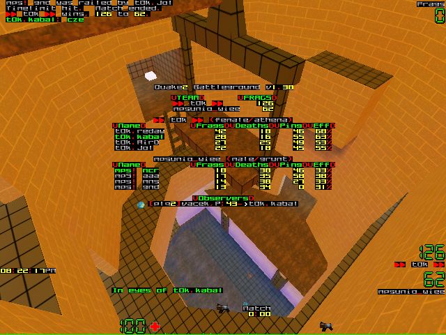Mapa walki o powerupy rozpoczela si? od wziecia red armora przez mps , przy czym tok mialo lepsze respawny i kontrola mapy nalezala do nich w pierwszych momentach ale to tylko pozory , gdyz drugiego powerupa wzielo mps (setka) . Kolejny powerup wziety przez mps (red armor) . Gora mapy by?a w rekach tok co nie dawalo jej przewagi poniewa? .... mps kontrolowalo nizsze partie mapy . Red armor wziety przez Redawa wkoncu pokazywal kto rzeczywiscie kontroluje mape . Pierwszy ps pojawil si? w dziwnych okolicznosciach oto Redaw strzelajacy rakieta za przeciwnikiem spadajacym do powerupa zabija ... swojego kolege z timu ale poprawil swój blad dobijajac enemy w powerupie ale ... o to niespodzianka do powerupa zeskakuje gracz mps a dokladnie aaa który wziol wlasnie pojawiajacego si? psa i zostal z nim zabity . Tak wiec pierwszy ps poszedl si? czesac . Miedzy pojawianiem si? powerupow trwala zacieta walka o rejla . Tok które by?o dobrze dysponowane tego dnia nie dawalo sobie odebrac tego cennego , widokowego miejsca na mapie . Czasami gracze tok (by? mo?e naladowani energia dzieki wygranej w poprzedniej mapie) ruszali do powerupa zbiorowo jako ze ka?dy chcial si? pokazac i zdarzalo si? ze spadalo ich tam po 3 tracac przy okazji punkt widokowy . Mimo takiej taktyki powerupy dalej ladowaly w rekach tokow a gracze mps jedynie co mogli to przygladac si? zbierajacym lecz nie dawali im wykorzystywa? w pelni powerupow zebranych zabijajac jak spadali na dolne pietro mapy . W tym samym momencie aaa postanowil wzi?? sprawy meczu w swoje rece zbierajac bfg . Jedyne co osiagnol to ... zabicie swojego kolegi z timu jak si? respawnowal . 5 minuta meczu wynik 33-16 dla tok i ... pojawil si? drugi ps którego wzial Redaw . Od tego momentu przewaga tokow nie podlegala dyskusji , chociaz tez by mo?na powiedziec ze tak tylko wygladalo z pozoru poniewa? kolejnego powerupa a by? nim ps wzial gracz mps Nocri , lecz nie dlugo si? nim nacieszyl od razu ginac . Gracze mps jedyna szanse na powalczenie z tok na tej mapie upatrywali w bfg . Samo wykorzystanie tej broni pozostawialo wiele do zyczenia . Kolejny ps w rekach tok . Wziol go Kabal , który mia? 18 zycia zbierajac go ale to mu nie przeszkadzalo i po chwili chlopak by? pelny zycia koszac przy okazji graczy mps . Nastepnego psa wziol .... Kabal . Podzielil si? nim z Airdem i tak oto po mapie biegalo 3 graczy z tok odzianych w szelki . Jol jako jedyny radzil sobie bez wspomagaczy . Swojego psa stracil Redaw który zostal ze squishowany przez boxa . Oko?o 9 minuty gry Guandi zrobil disconecta . Mps niechcialo holda tak wiec gra by?a kontynuowana w 3 osobowym sqadzie . Jako i? gracze tok postanowili grac w 4 zastanawialem si? tylko nad tym jaka b?dzie roznica fragowa miedzy nimi . Kolejnego psa wziol aaa asystujac sobie przy tym strzalem z bfg . Niewiele brakowalo a zostal by zblastowany przez Jola ale ladnie wybronil si? strzalem z rejla . Jako i? mia? malo zycia przekazal swoje szelki koledze z timu . Nastepny ps jaki si? pojawil wziol Redaw . 10 minuta meczu 65-35 . Po wspolnej akcji mps ginie Kabal który mia? psa i to by? chyba jedyny moment kiedy mps w jakis sposób potrafilo dorownac toka mimo ze dzielnie z psem utrzymywal si? przy zyciu Mon-Soon na nic wiecej ich po prostu nie by?o stac dzisiejszego wieczoru na tej mapie . 15 minuta meczu wynik 89-45 . Tok mimo posiadania powerupow nie potrafilo w pelni ich wykorzystac . Do konca nie zmienil si? ju? widok rozgrywanej mapy i tak oto tok wygrywa druga mape wynikiem 108-58.