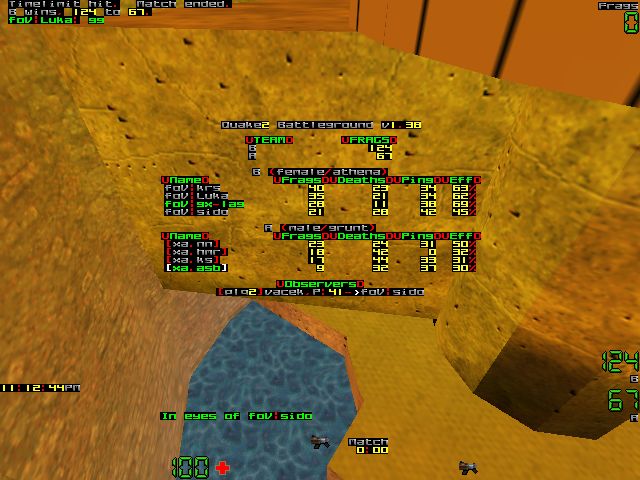 Wynik po 5 minutach 31-21 dla fov . Szósty quad dla Krzysztofa . W pewnym momencie przewaga fov zmalala do 2 fragow . Siodmy quad zebrany przez Krzysia . Osmego quada wziol Sido . Dziewiaty quad dla fov (Kris) . Zabity przez bfg Sida . Dziesiaty quad w rekach Krzyska (zabity) . W miare uplywu kolejnych minut xa stawialo coraz mniejszy opor gracza fov , którzy ciagle powiekszali swoja przewage . Wynik po 10 minutach 60-38 dla fov . Jedenasty quad zebrany przez Krzysia (zabity) . Kolejny quad znowu zebrany przez Krzyska .