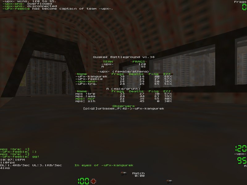 Pierwszy pent dla mps, ktory za wiele im nie dal bo na rg upx i tak sie ulokowalo, ale za zbieraja kolejne quady. Po 5 min mamy remis, bekowa akcja slesha ktory wskakuje po quada po glowach 2 enemy i zabija ich z granata:D Kolejny pent dla mps...Wydawaloby sie ze powinno mps wygrywac a tak nie jest, piraci skutecznie od areny ciukaja ich z rg, nie przeszkadza im w tym nawet wynoszone przez maniakow quady i penty. Po 10 minutach 10 fragowe prowadzenie piratow. Nastepny pent i quady juz dla nich ktorzy powiekszaja szybko swoja przewage. W 7 minucie mps odbija rg ale tylko na 2 minuty bo kolejny pent i zarazem ostatni dla piratow, ktorzy grali dalej konsekwentnie i utrzymuja przewage fragowa ktora wczesniej nastukali. GG.