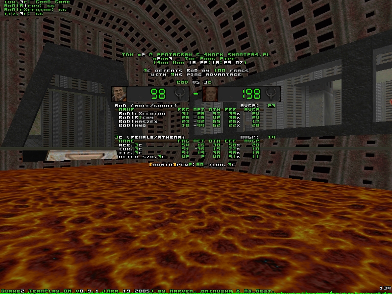 Po ustaleniu IP na ircu weszli?my na serwer. Ch?opaki przed w?a?ciwym meczem postanowili si? rozgrza? w oczekiwaniu na lukaha i zagrali 2v2. Po wej?ciu lukaha rozpocz?li?my mecz. Wybranymi mapami zosta?y: q2dm2 (3c) oraz q2dm3 (BoD).