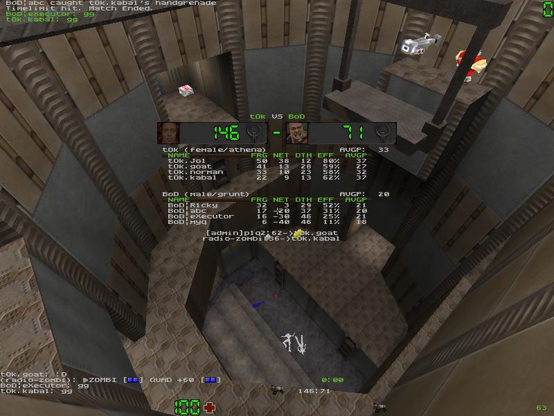 Ostatnia mapa to q2dm5 Tutaj znów bardzo wyrównana gra z przewag? BoD, ra od pocz?tku w r?kach myq, pierwszy quad executora. Po kilku minutach niewielka przewaga BoD, ale tOk zaczyna coraz cz??ciej przeszkadza? exe w wynoszeniu quadów, gromadz?c si? na walcu. Ra zostaje odbite przez toki, ale po nied?ugim czasie znów myq tam go?ci. Niemal do ko?ca bardzo wyrównana gra, na ko?cu z niewielk? przewag? tOk, ko?cówka to zdecydowanie ze strony tOk efektywno?? Jola, ze strony BoD gra rick1iego. Gracz mapy Jol Gracz meczu Jol