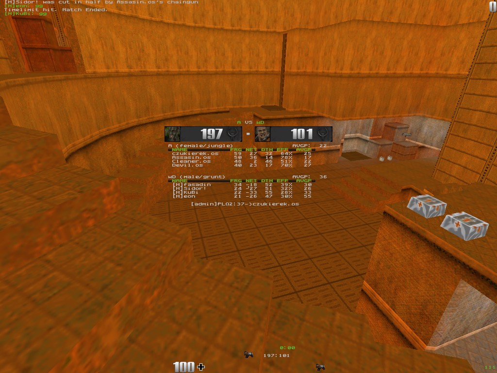 Sidor ma RG, a eon BFG, 2 quady fasadina i h radzi sobie calkiem niezle. Po paru minutach jednak na bfg siedzial sobie juz czukierek, quad dalej fasy, a na RG zmiana - assasin przegonil sidora. Nastepnie quady troche dla cln'ra. I walka jak dotychczas bardzo wyrownana. Fasadin zbiera q, pedzi w strone RG, ale zostaje zatrzymany przez assasina. Wyraznie bylo widac, ze od przejecia BFG i RG gracze h byli zagubieni, a przewaga os rosla w zastraszajacym tempie. W 10 min na przelamanie fasadin blastuje cln na quadzie, ale nie upolowal nic wielkiego jak przystalo na ?owce :>. Chwile pozniej mamy niemal identyczna sytuacje, ale tym razem to Cln'r po ataku fasadaina na quadzie z 1 hp! wyciaga q ;D Ciekawostka moze byc to, ze od 6 min. mielismy przyjemnosc spotkac laczacych sie do servera kubich twierdzacych " czemu mnie chcecie kikac, tez jestem z h" (kostek ty kryminalisto :DD). Ani sie nie obrocilem, a fragowa przewaga wyniosla +100 dla os ! Na dodatek pride doznal laga, ktory nie zamierzal ustapic, a gra zaczela wygladac jak polowanie i os wcale nie bylo tu zwierzyna :D 2-0