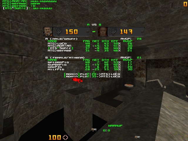 Kolejna mapka jest dm3. Po ci??kim meczu na dm6 gracze obu klanów musieli troszk? odetchn?? przed wpisaniem redy. Chwila oddechu, fajka, opanowania emocji oraz nerwów, no i ruszamy. 3... 2... 1... 0... ! Pierwszy pent dla MTG a quad dla Pigs. Poczyna? quada nie zaobserwowa?em, chyba szybko zosta? ubity, natomiast Adrian z pentem wyczy?ci? okolice rg. Na quadzie na dm3 walczy? dominator z milfi, na ssg befree z drk, a na rg super i spider z loco oraz adrianem. Po 3 min gry MTG wysuwa si? na Bardzo duze prowadzenie oklo 20+ fragow, a quady wci?? zbiera sonic. Mi jaja kolejne 2 min i przewaga ro?nie a ch?opaki z pigs nie radza sobie na rg. W kolejnej cz??ci gry Q na zmian? wynosz? gracze pigs i mtg, lecz te dla mtg raczej szybko zasta?y ubijane. Za pare sek. pent i ju? tam czeka SpiderPig w mi?dzyczasie loco dalej czy?ci na rg. Po wzi?ciu penta MTG szybko czmychn??o z pozycji nie trac?c kluczowego dla nich rg. Mija kolejne 8 min gry i wyró?niaj?ca si? postaci? w mtg jest Loco (staty 21:5) W tym czasie bohaterski sonic z 1hp zycia wynosi quada i oczyszcza ssg oraz oczyszcza okolice penta. Po paru sek. ginie on jednak z reki drk. Mamy 9min gry za nami i punktualny sonic zdo?a? wskoczy? do 666, czaj?c si? na kolejny cenny powerup. W mi?dzyczasie spiderPig bierze Q lecz nie zdo?a? on odbi? dobrze strze?onego rg. (mog?o to by? jednak spowodowane tym, ze dzier?y? on w rekach jedynie blaster :D.) No i w ko?cu sonic doczeka? si? penta... zaczyna swoja wypraw? po fragi, jednak w pospiechu wpada on do lavy na arenie :D, jednak kole?e?scy gracze mtg po?yczyli mu rl ;p. W 8 min sonica na quadzie wyr?cza befree, lecz zostaje szybko ubity. Kolejne 2 min gry i przewaga MTG dzi?ki wyniesieniu kilku q przez pigs maleje z 40 do 30 fragow. Znów quad dla pigs, a konkretnie dla dem'a... zaczyna si? walka o ostatniego penta!! Mija kolejna minuta i w ferworze walki MTG zapomina o q i zabiera go znów dem, czy?ci on okolice 666, i po udanym q runie bierze penta! Mtg prowadzi juz tylko 10 fragami i mamy 3 min do ostatniego gwizdka s?dziego :D Majnd de gab zaczyna bunkrowa? si? na rg, ale decyzja ta nie op?aci?a si? bo w 1:30 do ko?ca pigs czy?ci i ta pozycje. Ostatniego q jakim? cudem bierze sonic :D co pozwala mtg utrzyma? 10fragowa przewag?. 40sek do screena i mamy 8 fragow przewagi dla mtg!! Pigs na rg, pigs na ssg a mtg si? ketra:D ... 20 sek i 5 fragów dla mtg. Sonic i adrian chowaj? si? w YA roomie ale ?winie ich wyw?szy?y :D Mamy 10 sek i 2 fragi dla mtg... szybka wymiana ognia ... nie wiadomo za bardzo co sie dzieje iiiii 3 ... 2... 1 ... walka ci?gle trwa ... MTG WYGRYWA 1 FRAGIEM :D