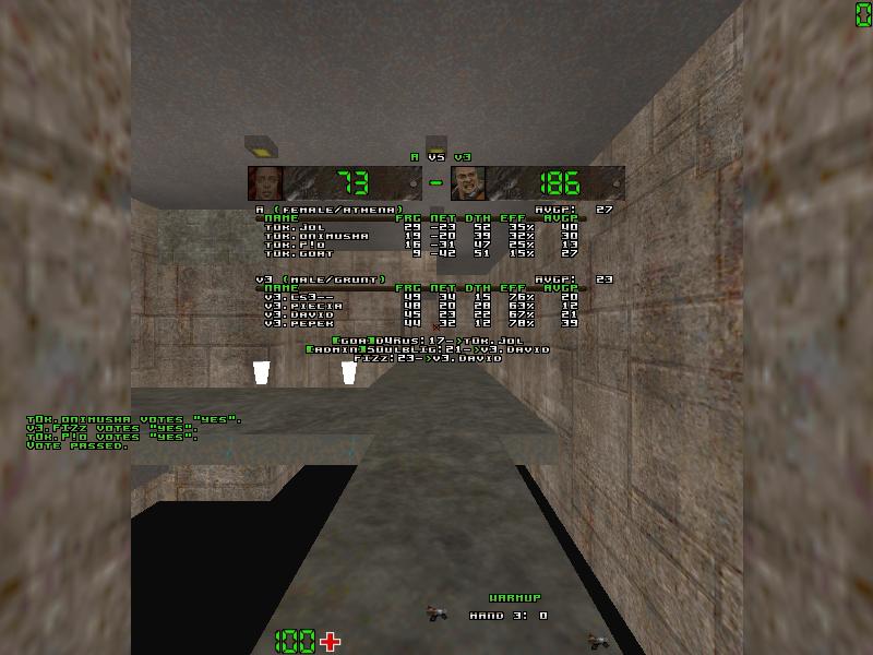 DM3 wyglądało jak to dm3 w spotkaniach na najwyższym poziomie. pierwszy quad jak i pent poleciał dla v3. Rozgrywka wyglądała imponująco bo po szybkim starcie przewaga v3 wzrosła do ok 20 fragów,potem do 30 i tak wszystko ładnie pięknie aż do momentu gdy w ręce ONIego wpadł rail i zbijając 2 quady pozwolił swojej drużynie na chwile oddechu i przygotowanie się do kontry. I tak teraz ToK dzielnie panowało na quadzie a gracze v3 na rg (oraz często zapuszczali się na RL). Niewątpliwie wrażenie robiło zachowanie graczy v3 którzy na widok quada rozbiegali się we wszystkie strony i co śmieszniejsze po końcu quada wracali na pozycje jak niby nigdy nic. przewaga klanu v3 spadła pod koniec do zaledwie kilku fragów( najniżej w okolicach 4 ) jednak w końcowym bilansie udało im się zakończyć mecz z wynikiem +14.