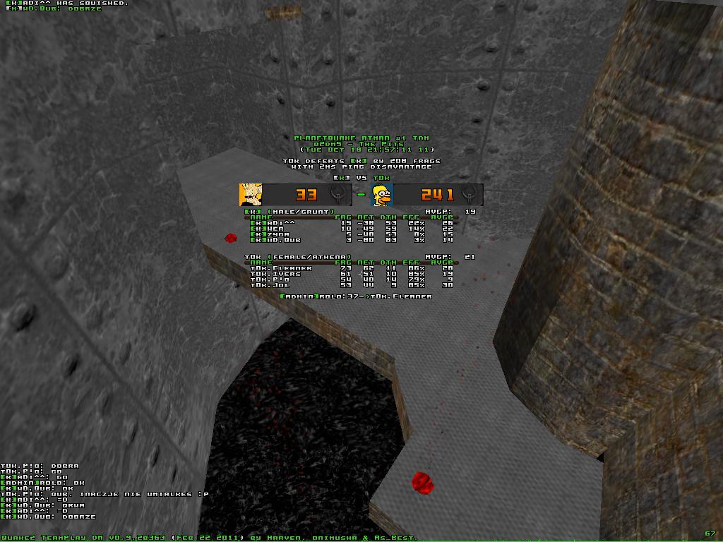 Normalnie wieczór dobroci: najpierw tOk czekało na [k], potem [k] pozwoliło tOk zagrać ich mapę jako pierwszą. Bob Marley will be proud! Tak więc zaczeliśmy od chyba najlepszej obecnie mapy tOk - dm5. Od początku do samego końca walka toczyła się frag za fraga. Przeciwnicy, nie zwracając uwagi na ból palców... Dobra, co ja pierdole. No rape było. [k] zebrało solidną chłostę, jednak mimo całego sromu owej porażki kanapki tak na prawdę nie wyglądały źle. Przez ok 5 minut udawało im się skutecznie bronić ra, potem zaś coraz starali się jak mogli, by utrudnić niezo życie tOk. Dankowy klan za to grał swoje - Cleaner zataczał mordercze kregi z quadem, P!o strzelał z rg, a Ivers liczył sobie armora. Wynik +200 na dm5 mówi sam za siebie - own3d und loled. Jako ciekawostkę proszę sprawdzić skrina: http://img207.imageshack.us/img207/5287/dm5bg.jpg - w takim kodzie kreskowym przyszło grać zydze. Tym samym szacunek dla [k], bo walczyli.