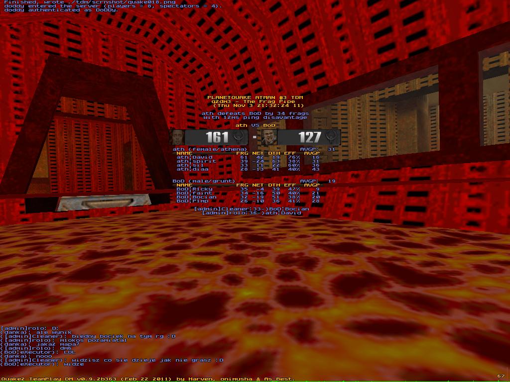Mapa zaskoczenie, bo nie spodziewałem się tak wysokiej wygranej ath. BoD musiał przytłumić nieco gorszy początek (dwóch graczy na -), do tego znowu niepokorna postawa Duvidka na rg, który tam się panoszył jak Legion Maryi na cmentarzu w Święto Zmarłych. BoD nie mogło się zdecydować co odbijać: czy q, na którym rozkurw sprzedawał tanio i chętnie spirit, czy rg ze wspomnianym Dawidkiem. W BoD jedynie DoDDy jako tako ogarniał swoje (BFG) i miał udział w akcji-lolu-pindolu, jak trafił kicającego po kładkach spirita (w stroju policjanta) z rg, a ten w cudaczny sposob, kicając nadal spadł do lawy.