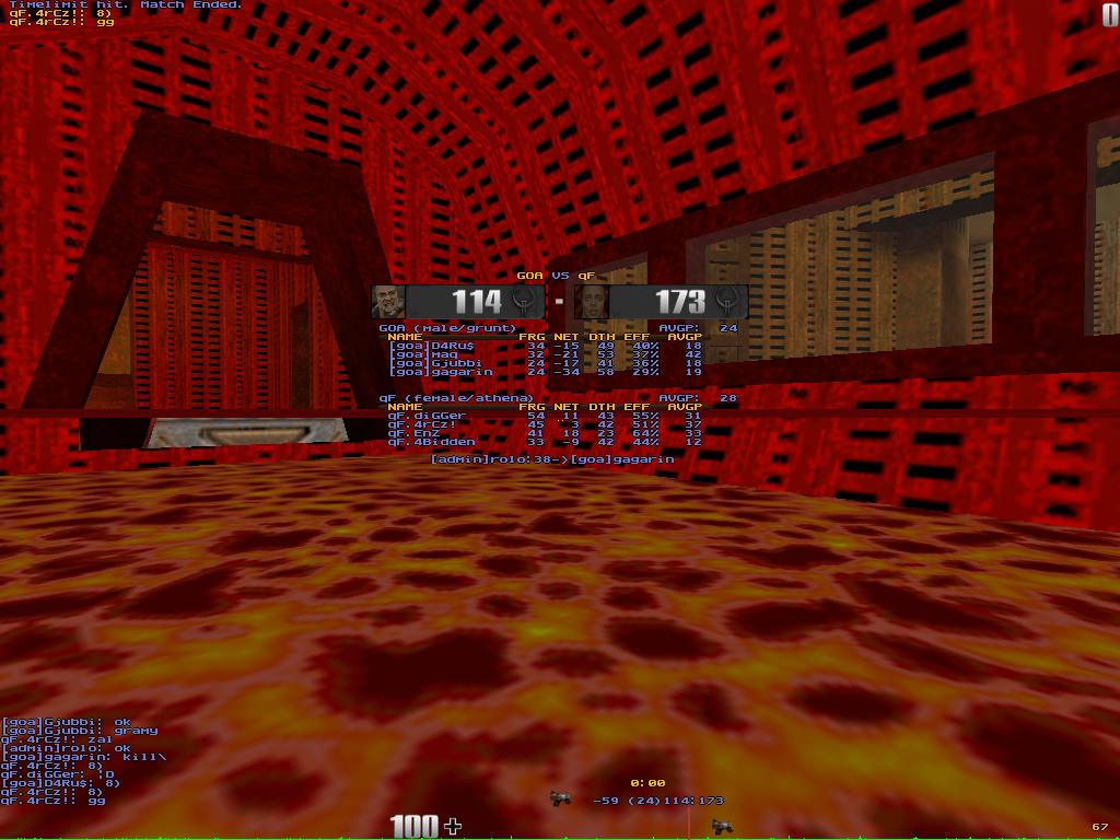 qF otarcie się o glorię na dm5 musiało srogo rozsierdzić, bo na dm3 już nie było zmiłuj. Od początku do końca gracze tommy'ego siedli na GOA i odbierając im oddech zostali tak już do końca. nie pomogły 2 penty gagarina. qF podzieliło się na dwie pary: Arczi i diGGer grali quada, a Enz i 4b rg. Obie grupki bardzo dobrze wywiązały się ze swojego zadania. Enz zjadł maq na rg (który swojądrogą jakoś długo się budził na dm3), a duet A+D na zmianę wynosząc q siał tęgie baty w każdym zakamarku dm3. Po przeciwnej stronie barykady wybijającą się postacią był Daruś, który dotkliwie kąsał Fanatyków po pęcinach, starając się wybić ich z rytmu. Dało to niestety nie wiele, bo chociaż po słabych pierwszych 10 minutach GOA obudziło się w końcu, to jednak qF byli już na bezpiecznym dystansie +40, który w najlepszym momencie Światłości zmalał do ~20 fragów. Ogólnie qF ownage i już.