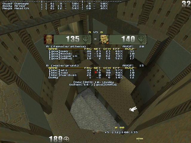 q2dm2 Bardzo wyrównana mapa oraz dobra postawa obydwu drużyn. o Włos od zwycięstwa byli gracze GOA, ale maq za mało fragów zdobył :DDDD dobrze również spisywał się Roodi dzisiaj co mnie lekko zaskoczyło bo go dawno widziałem w akcji ;D Po drugiej stronie barykady szalał atz i mało co nie skończył by z wynikiem pół stówki :D