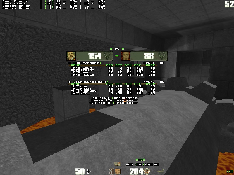 q2dm2 Mapa na której szybko PFH zdobyło przewagę. Przejęte RA ułatwiło nam rozgrywanie tego pojedynku. Na początku przekomarzania, który to u nas będzie grał RA, ok. padło na fainta :) jak widać bardzo dobra decyzja. Trzymał precyzyjnie co zostało okraszone mała ilością deathów :) Pod Ra dzielnie rządził abc co wyniosło go na wyżyny i zakończył mecz z bardzo dobrym rezultatem. Kolejny raz dobra gra abc pod RA :) Jeśli tutaj było raczej wszystko poukładane do na quadzie było dużo walki. Niggy dla którego ping +100 nawet nie jest straszny oraz Ja staraliśmy się aby wyciągnąć jak najwięcej kładów. Lecz nie było łatwo. Po drugiej stronie gracze THC całe swoje zastępy wysłały do walki o Q. Lecz i to nie dawało zamierzonych korzyści. Starałem się jak mogłem, wspomagany przez Niggy'ego nie dawaliśmy się rozpędzić graczom THC.