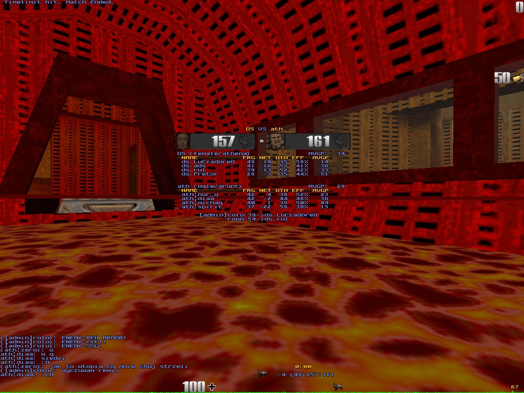 Home map michaq, chociaż i reszta graczy Anathemy radzi sobie nie najgorzej na niej, jednak tego wieczoru nie podołali wyzwaniu w osobach wojaków DS. Od pierwszego gwizdka ekipy podzieliły się na sektory: większość quadów wynosiło ath, DS mocno zabunkrowało się za to na Redzi, gdzie dobrze współpracowali Luczek Fluczek i ADS the JUMPER. Na quada z partyzancką misją wysłani zostali Rulon i Pretor. O ile temu pierwszemu grało się dobrze i niezłymi akcjami (m.in. 3 z cg przy basenie) wkurwiał ath, o tyle Pretor nie mógł rozwinąć skrzydeł przez złe warunki, czasem wyglądało to tak, jakby przebijał się przez budyń. Z szeregów ath najwięcej efektywnego wiatru robił Norek, samemu wynosząc quada, albo pomagając w wynoszeniu go fejkowi michaq, bo przecież to nie był michaq, bo nie wygrał dm2, nie?! Graczom Anathemy zabrakło nieco farta/skilla/whateva, bo mimo przewagi w basenie nie udało im się na dłużej odbić ra, a to była woda na młyn dla DS i klucz do sukcesu, bo straty na quadzie wetowali sobie z nawiązką bijąc pod Ra. Proszę duet ADS|LUCZEK o wrzucenie demek, warto popatrzeć na dobrą współpracę.