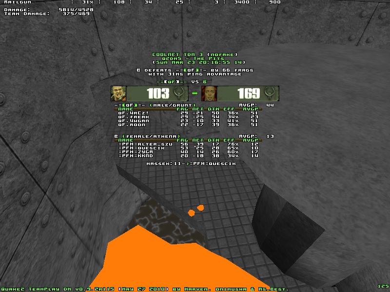 q2dm8 Na początek meczu starcie na q2dm8. Mapa, którą ostatnio pfh dużo grywa i coraz to większą moc na niej pokazujemy gdy tylko gramy w optymalny składzie. Zbierane powery zwłaszcza przez Altera i Questa dałby wyraźną przewagę PFH. qF miejscami pokazywało zęby, zwłaszcza na rg. Dzisiaj jednak na tej mapie Alter i Quest byli nie do zatrzymania. Dół pilnowany przez KKND i mapa kończy się wynikiem 200:64.