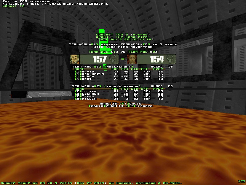 q2dm3 PO ładnej strzelaninie na q2dm8 Najlepsi Gracze tej edycji plq2 rozpoczęli zmagania na q2dm3. Przewidywałem tutaj niesamowitą walkę, ponieważ kto inny na tej mapie się czuję tak dobrze David i Cleaner. Dzisiaj jednak ten drugi miał utrudnione zadanie w zdobywaniu niebieskiej broni, wspomagany przez zottera napsuli dużo krwi przeciwnikom, lecz szczęście było o krok. Bardzo dobrze zaczęli gracze "dwójek" i wydawać by się mogło, że są jak na najlepszej drodze do wygrania, to jednak do głosu dochodzili przeciwnicy. W prawdziwą furię strzelania wpadł David, który kiedy dopadł RG nie było na niego mocnych co można zobaczyć na załączonych screenach. Oczywiście były momenty kiedy do piecia przejmował pozycje na górnym rg i obraz chociaż na chwilę ulegał zmianie. Niestety dla [2] mecz został rozstrzygnięty na korzyść przeciwników, a całym sprawcom tego zamieszania i najlepszym Graczem meczu zostaje David. Tym razem zabrakło tak niewiele a mapa kończy się wynikiem 157:154.