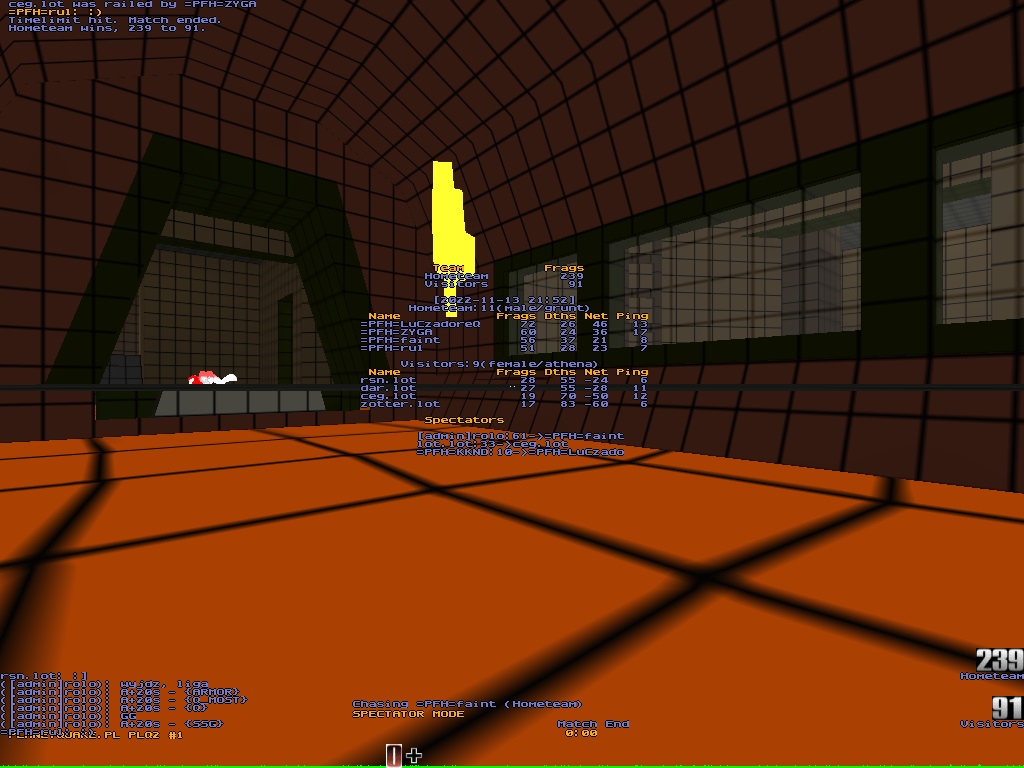 Mecz rozpoczął się od mocnego uderzenia faworytów: Penta zebrał Faint, a Quada Luczadorek. To mocno ustawiło początek rozgrywki, Lotnicy dostali siarczystego liścia, z którego chwilę musieli się otrząsać. PFH wykorzystali impet, bo ich łupem padły 3 kolejne niebieskie powerupy (tutaj należy pochwalić Fainta, bo to on je wszystkie zgarniał, jak i większość w meczu, będąc szczerym), a wywołana tym fala tsunami zepchnęła Władców do głębokiej defensywy. W wyniku powyższych przetasowań na RG usadowiło się dwóch rewolwerowców PFH - Luczek i Zyga. Do Quada oddelegowani zostali Rul i Faint, mając za adwersarzy... w sumie całe Lot. Oczywiście to moje subiektywne odczucie i mogę się mylić, ale Lotnicy chyba dość szybko odpuścili sobie bitwę nad kwasową kałużą, gros sił koncentrując na krzyżowaniu planów PyFyHy odnośnie "Poczwórnych" (btw. w polskiej wersji QC tak mówi spiker, kto to wymyślił :O). Tak więc o ile na rg i w okolicach centralnej areny raczej byliśmy świadkami bicia po respach, tak na Q trzeba było się sporo napocić. Bardzo podobała mi się postawa Darusia, który mądrze blokował przeciwnikowi możliwość swobodnego liczenia i zbierania rakietnicy. W tym rejonie trwały bardzo zażarte walki, często quadder Play for Honor (tak jak wspomniałem najczęściej był nim Faint) musiał dosłownie wymieść RL, które było punktem wyjścia dla kolejnych partyzanckich ataków Lot. 2 pent padł łupem Zygi, niestety nie widziałem w jakich okolicznościach, bo akurat obsowałem Luczka, który robił sobie festiwal kolejnych trafień z rejla. Przewaga wyżej notowanych PFH rosła wykładniczo, po 9 minutach meczy oscylowała w granicach 70 fragów. Co ciekawe, wspomniane bardzo ciekawie rozkładały się na poszczególnych graczy: w okolicach półmetku różnica między liderem a 4 z graczy PFH wynosiła raptem 6 fragów. Po drugiej stronie barykady, oprócz wymienionego już Darka, dwoili i troili (a nawet quadzili) wszyscy zawodnicy - podziwiam zwłaszcza cierpliwość Zottera, bo mocno go rejle poturbowały. Zwłaszcza podobała mi się akcja w jego wykonaniu w okolicach 7 minut do końca, gdzie jak za najlepszych czasów w v3 wparował od kładki, ubił dwóch niemilców i jak gdyby nigdy nic zabrał sobie Quada. Widać pewnych rzeczy się nie zapomina. Trzecia nieśmiertelność została zebrana przez Cega, jednak mądrze wycofujący się gracze PFH złagodzili nieco efekt tego zajścia, stąd nie udało się w znaczący sposób CLowi Lot zmienić układu sił na mapie. Reasumując, mapa mocno pod dyktando PFH, kluczowe rejony trzymali mocno, nie pozwalając Lot na za dużo swobody.