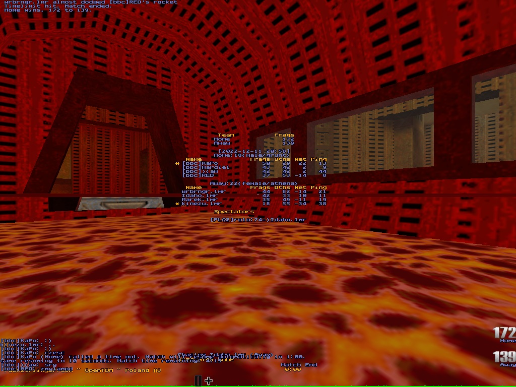 Jako, że żaden z CLów nie zgłosił potrzeby zmiany ponownie szybciutko rozpoczęliśmy finalną potyczkę. Początek 20 minut tym razem na korzyść lmr, Idaho jako pierwszy odwiedza powerupa, którym okazuje się Power Shield. Festyn nie trwa jednak długo, po około 90 sekundach znajduje on swojego nemezis w sobie ><awa, który blastuje go, wysyłając Psa hen daleko (swoją drogą ciekawa była ta akcja przy górnym CG, po Ida po drodze do śmierci zebrał kombosa w postaci rakiety enemy, rakiety od swojego i chyba dodatkowo eksplozja granatu ręcznego go uszczupliła). Efekt jest taki, że po 3 minutach nie mamy na mapie zawodnika, który by nie zginął chociaż 1 raz (najdłużej ostał się wrbrngr). To właśnie Litwin zbiera kolejnego PS, a przewaga lmr zaczyna się wymykać powoli bbc z rąk. Do wyróżnienia na apelu ponownie trzeba wyczytać KaPo, który w pojedynkę próbował utrzymywać w grze swój klan. Gwoździem do trumny Be Be Ce jest półmetek, kiedy to kinezu również przywdziewa zieleń inspekcji transportu drogowego, a w poczynaniach lmr widać większy luz spowodowany komfortową sytuacją. W partyzanckich atakach na górne rejony mapy nie ustaje xawik, co ma niestety przełożenie na jego nieszczególne statystyki, chociaż ambicji odmówić mu nie można. Kiedy zegar wybija 5 minut do końca rezultat wydaje się rozstrzygnięty, lmr dociska gaz do podłogi i systematycznie tylko buduje przewagę, która nie jest w żadnym momencie zagrożona. Kolokwialnie ujmując, udaje im się "odstawić" [bbc], których zatrzymują poniżej 50 fragów, co pokazuje dominację triumfatorów.