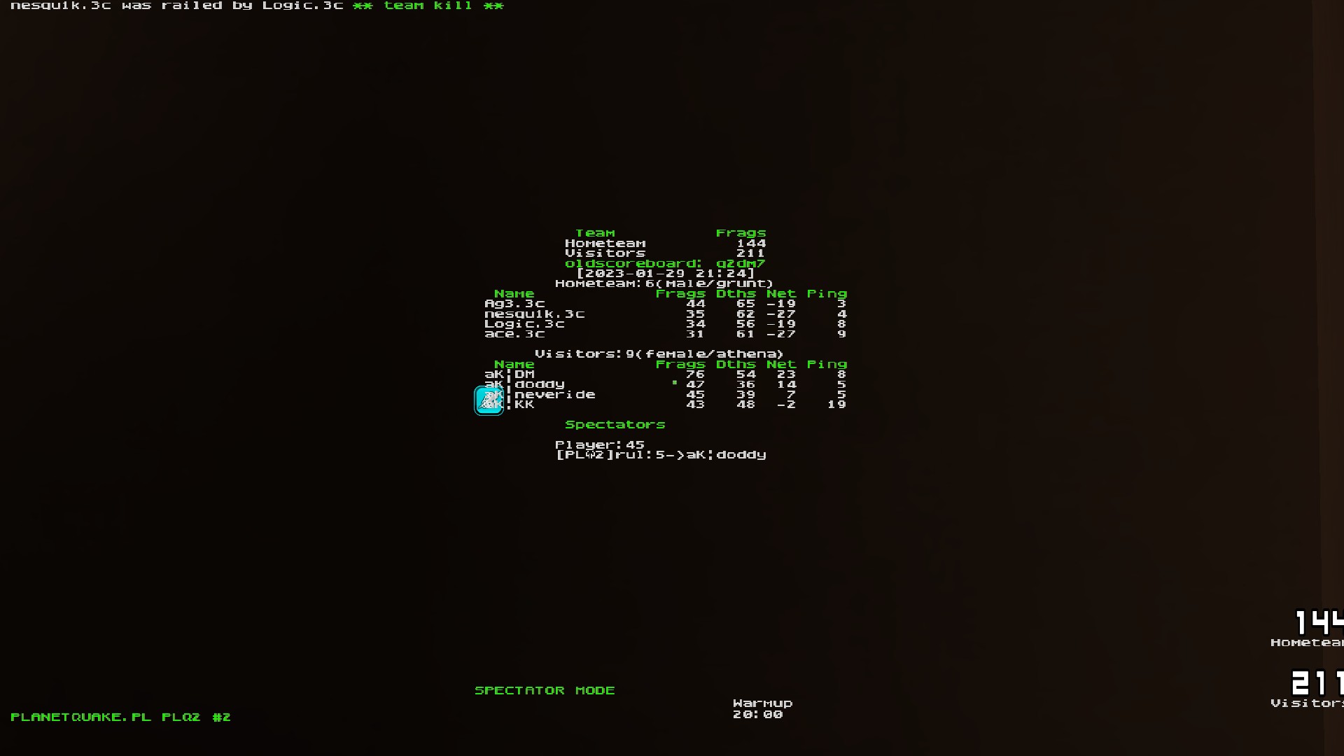 Q2DM6: Thriller i fantastyczna pogoń 3c, gdy w pierwszej części meczu DM panował na rg aK zdołało odskoczyć 3c na około 30-40 fragów przewagi. Druga część meczu to włącznie się po ospałym początku Adiego o walkę o rg i quadruny Ag3. 3c w końcówce zdołało dogonić i finalnie przegonić przeciwników. Brawo, za udany comeback! Gracz mapy Ag3, wyróżnienie leci do DM za świetny początek.