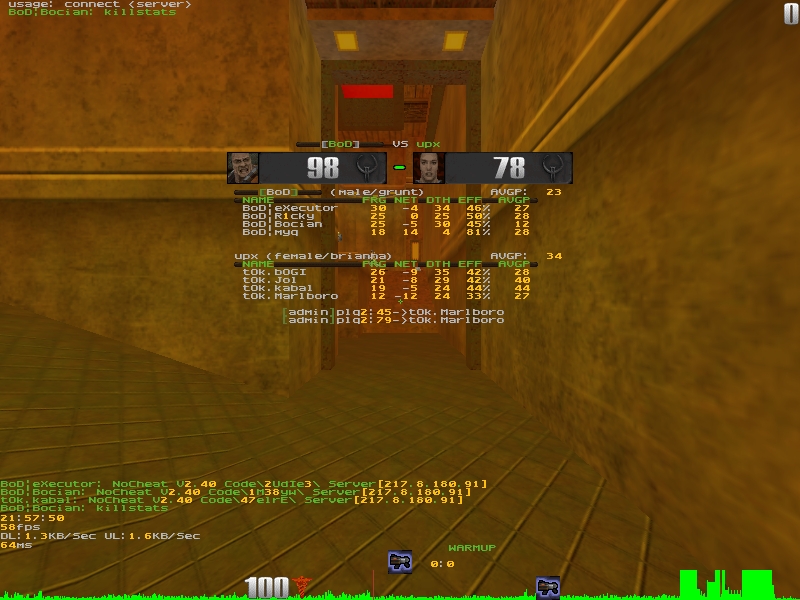 Szybkie redi i lecimy ;-p Poczatek dla boD ktore objemuje prowadzenie. Kilka raili exekuta i bronienie wody przez klekacza szukajacego zabusi ;-p i BoD prowadzi juz kilkoma fragami. Po chwili Tok bierze sie do roboty i odrabia stare wychodzac nawet na kilkufragowe prowadzenie, ale ekipa Bociana klekacza i exego bierze sie znowu w garsc. Gra sie wyrownuje, graja frag za frag, ciezko ktorej ekipie odskoczyc na wiecej niz 4-5 fragow. Pozycje naprzemian raz t?ok w oomie z Boty sie opalaja ,innym razem ludzie sie schodza i mamy t?ok nad woda z boty w roomie. Ale w jednej chwili kiedy Cg dorwa? bOGI a Rg sil tok odskakuje na 15 fragów, po chwili juz 25 fragów, wydaje sie ze chyba koniec emocji. P ochwili juz 30 fragów , przewagi ... 40 oczek... 50... BoD wyraznie wybite z rytmu, nie moze znalesc sobie miejsca. Przewaga tok osiaga juz. nawet 60 fragow. Ladna gra sila nad ba?tykiem, i reszty ekipy tloczonyj w ciasnym roomie. po osiagnieciu takiej przewagi tok wyraznie przystopowalo, juz nie uciekaja tak mocno, i Bod coraz to proaz wpada do roomu albo nad wode. Widac bod poczu?o szanse ze moze cos jeszcze zdzia?ac, mocno sie sprezy?o izacze?o odrabiac straty, oto ma?y wyciag z konsoli: