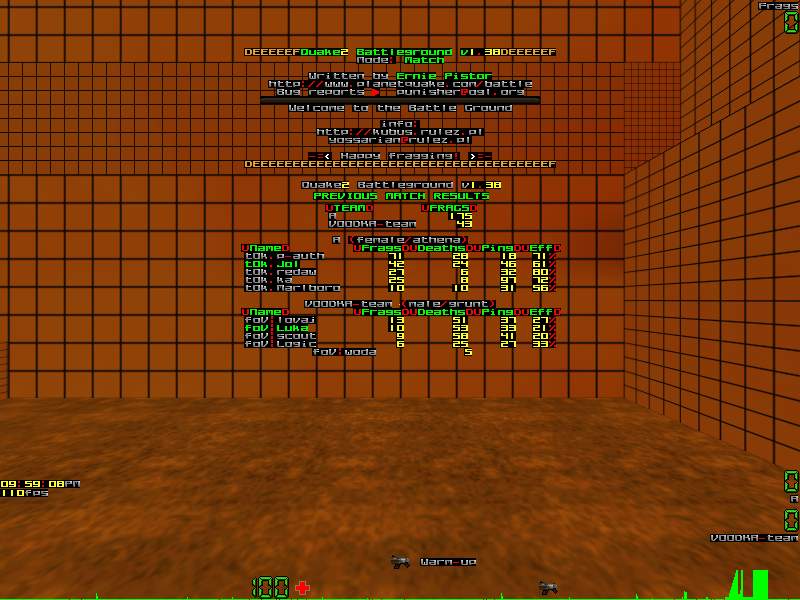 Q2dm6: 3,2,1... Niech masakra fov si? zacznie (tak mo?na zatytu?owa? t? map?) . Ju? przy pierwszym quadzie by?o wida? , kto wygra . Do quada wskakiwali dwaj gracze fov oraz Auth . Wynik ? Auth ubiega przeciwników (zderzyli si? jak spadali do q i wpadli do lawy....) i zaczyna rze?nie . Reszta pozycji (rg , bfg) by?a ju? w r?kach tok . Na os?od? pocz?tkowo fov mia?o rl/cg ale to zmieni?o si? przy nast?pnym quadzie w którym czeka?o ju? 3 graczy fov . Do q wpada Auth , który zbiera go (LOL) i ginie od rejla Jola ... i to chyba tyle je?eli chodzi o akcenty istnienia fov na mapie . Jednym s?owem mo?na nazwa? reszt? mapy NUDA . Czasami gracze tok wpadali sobie do lawy ale to i tak niczego nie zmienia?o . Wynik ko?cowy 175-43 dla tok .