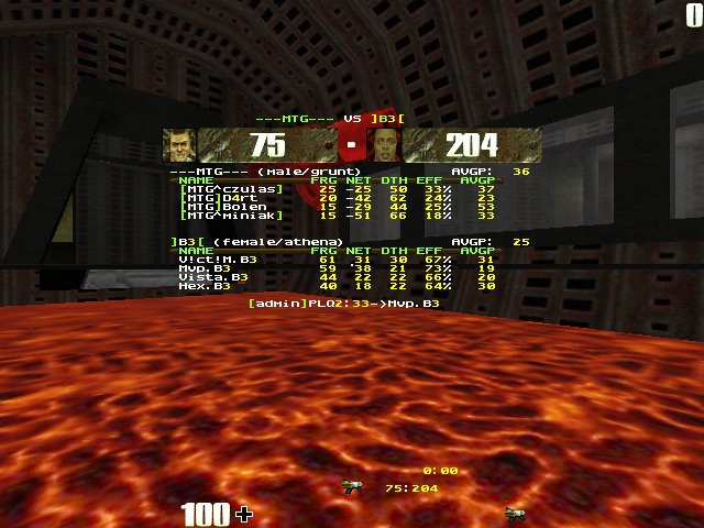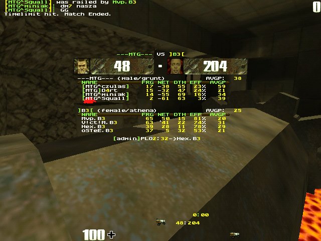 Ostatnia mapa - dm3. 'Nie widze zadnych rewelacji - czulas to max, co moze z Ciebie byc...' Slowa te chyba calkiem wymiernie obrazuja wydarzenia jakie mialy miejsce na trzeciej i ostatniej mapie. FFa, calkiem luzne zreszta, w wykonaniu mtg vs calkiem dobremu tp by b3. Bohater meczu czulas od czasu do czasu nadmienial, iz kolega hex zaskakuje go swoja gra... Kilka razy mielismy tez sytuacje, w ktorej ktos sugerowal, iz gracze b3 czerpia dochody z nierzadu... Nie wnikam w to, bo i po co ?:) Penty w posiadaniu b3, quad w posiadaniu emvipi, rail w posiadaniu victima. Nieczesto obraz ten ulegal zmianie, no i mamy powtorke z 2 poprzednich map. B3 niszczy dzisiaj mtg, ktore nie potrafi sie odnalesc. Humor kolegom poprawial nie kto inny, ale oczywiscie czulas. Hint: CHlopaku - nigdy wiecej na meczach ligowych nie wyzywaj przeciwnika na pojedynki duelowe, bo Twoj tim na tym cierpi... Ostatecznie mamy wynik 204 - 75 i