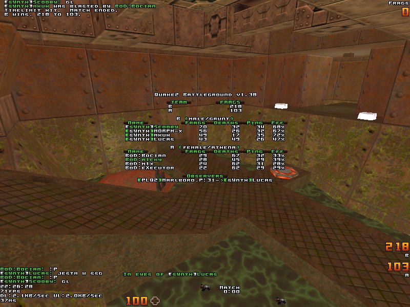 Jakie? 5 minut do ko?ca meczu, stan 110 do 85 dla BoD! Wydawa?o mi si? ?e ta mapa b?dzie zapisana na korzy?? kolegów eXecutora. Synth nie potrafi?o w ogóle si? odnale??. I tu pojawia si? posta? Scooby'ego, o którego charyzmie i mobilizacji wiele ju? mowiono. Odnios?em wra?ene ?e to w?a?nie on da? znak i jakby powiedza? "Koniec zabawy, bierzemy si? do roboty", kiedy mamy do czynienia z rozp?dzonym poci?giem, trudno jest go zatrzyma?. Wr?cz momentalnie nast?pi?o odwrócenie ról i w ci?gu 2 minut mamy remis a za chwilk? prowadzenie sYnth. Ostatnie 3 minuty to nerwówka - tak naprawd? nie liczy si? trzymanie pozycji, tylko zdobycie tylu fragów ile si? da. W ostatnich sekundach przewaga wynosi?a bodaj?e tylko 2 fragi. sYnth zdoby?o w ostatnich sekundach 2 fragi i mogli cieszy? si? 4-fragow? przewag?. Ostateczny wynik 140 do 136 dla sYnth.