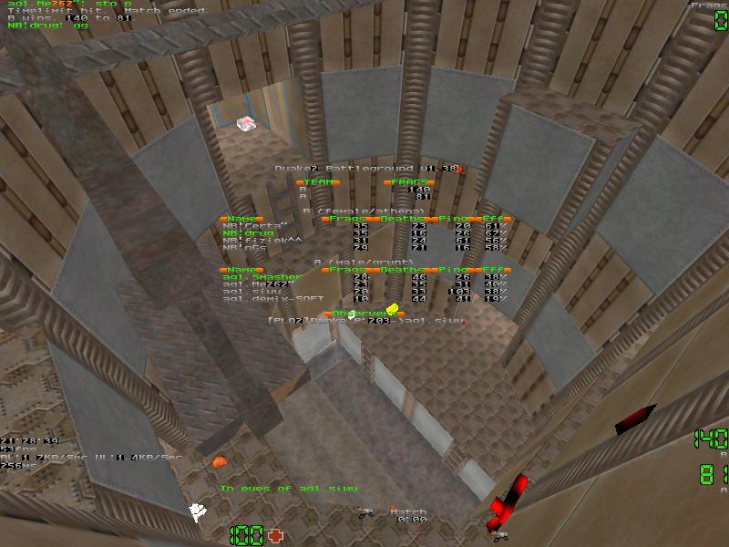 Pierwszy uad dla messera ale niestety to byl pierwszy i ostatni quad.. Reszta quadow zebrana w 95% przez fizka z NB i chyba 3 quady innego gracza (nGs badz Druga) ale to tez NB. Sytuacja na ra wygladala nieco inaczej, tylko przez pierwsze krótkie minuty na lifcie usadzilo sie NB, przed 16 minuta odbite przez AGL i taka sytuacja panowala niemal do konca. Sytuacja fragowa, przynajmniej do polowy meczu, oscylowala wokol remisu, w 14 minucie wynik 32:29 dla NB, w 10 54:46. O ile pierwsza polowa mogla dac nam nadzieje na wyrownany mecz, o tyle druga to juz mozolnie osiagana przewaga NB. Wynik koncowy 140:81